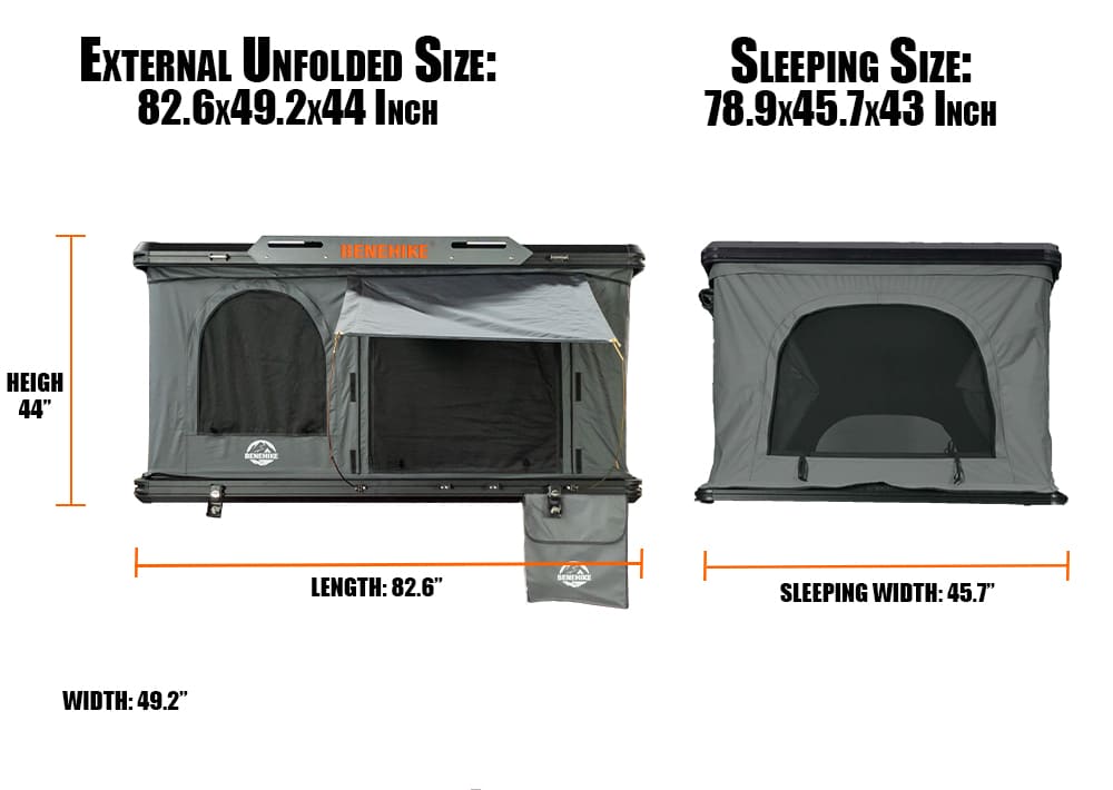 The BENEHIKE Alumabode V2 rooftop tent leads the industry with its integrated roof system seamlessly blending with off-road gear, boasting a capacity of 800 lbs! With a mere 6-inch increase in height and a weight of 187 lbs, it minimizes impact on fuel efficiency and payload.