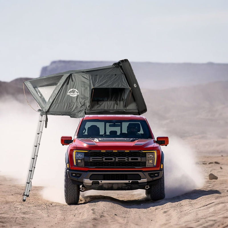 The BENEHIKE Bivvyy V2 is a hybrid side-opening rooftop tent that sets up in just 1 minute. Its streamlined, aerodynamic polymer cover minimizes wind resistance while driving, reducing MPG loss and aiding tent towing with the passenger side open.
