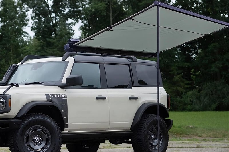 - It can be used in conjunction with rooftop tents, cargo boxes, or our roof racks. The installation rails and accessories are universal, compatible with most roof racks, cars, SUVs, and trucks' sides and rear, requiring just a few seconds to tighten the screws.