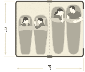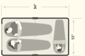 The 55" comfortably accommodates small groups, offering more space than a full-size mattress and longer than our hardshell tents.
