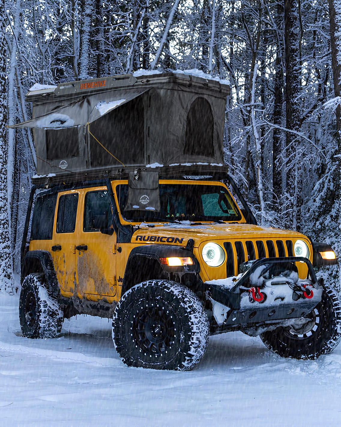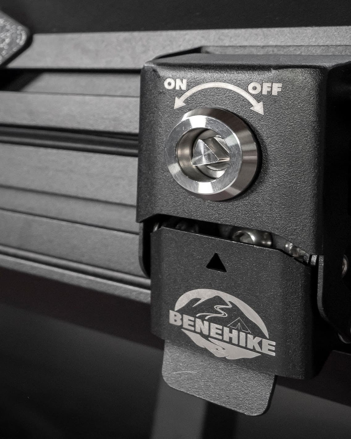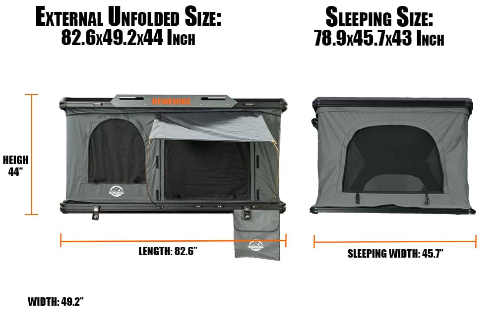 The BENEHIKE Alumabode V2 rooftop tent leads the industry with its integrated roof system seamlessly blending with off-road gear, boasting a capacity of 800 lbs! With a mere 6-inch increase in height and a weight of 187 lbs, it minimizes impact on fuel efficiency and payload.
