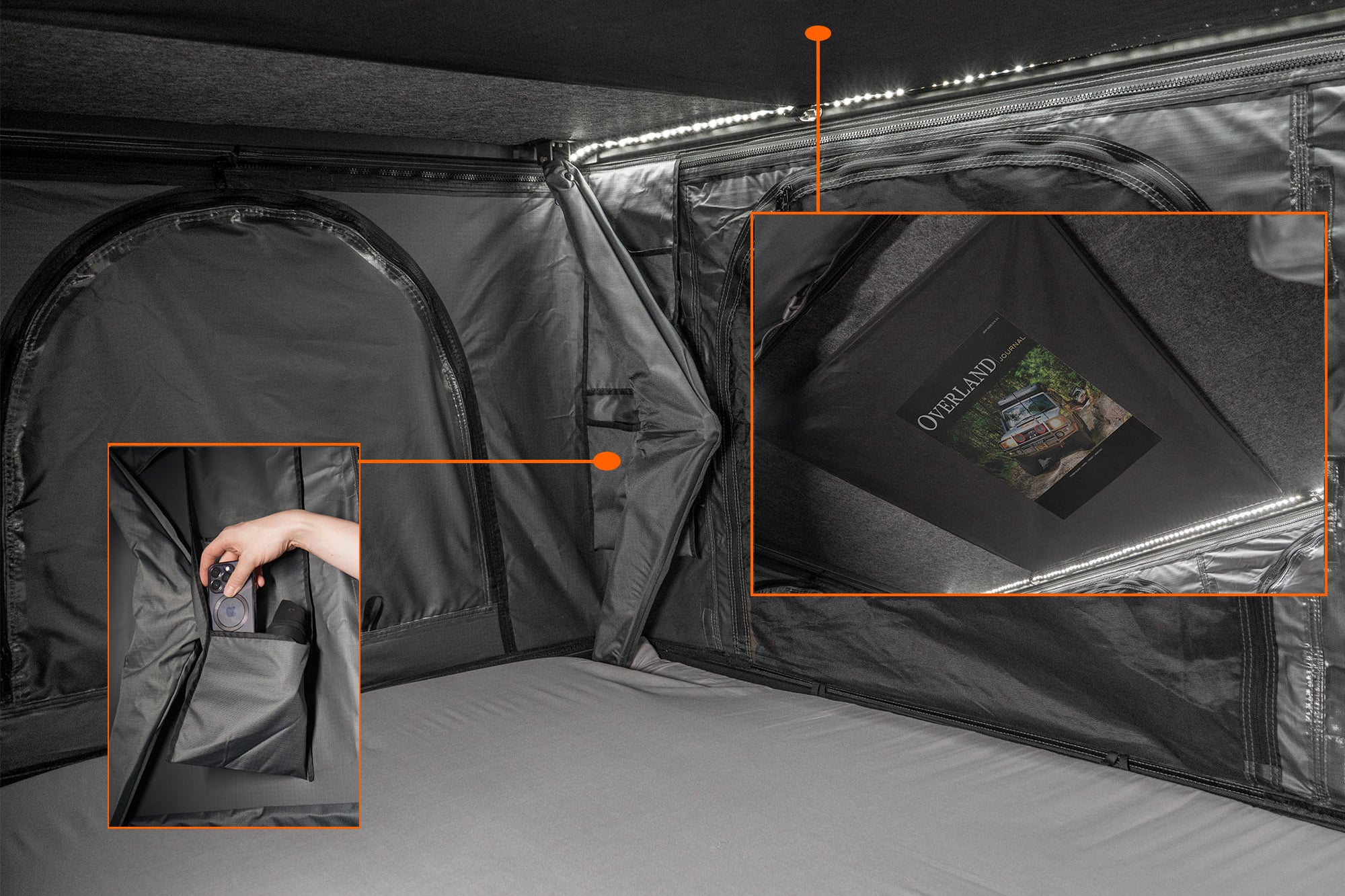 Even when closed, the Alumabode V2 can store our sleeping gear inside the tent. At the top of the tent, the seamlessly integrated roof crossbar system is designed to carry bulky gear weighing up to 800 pounds, while side panels allow easy access to small essentials on the go.