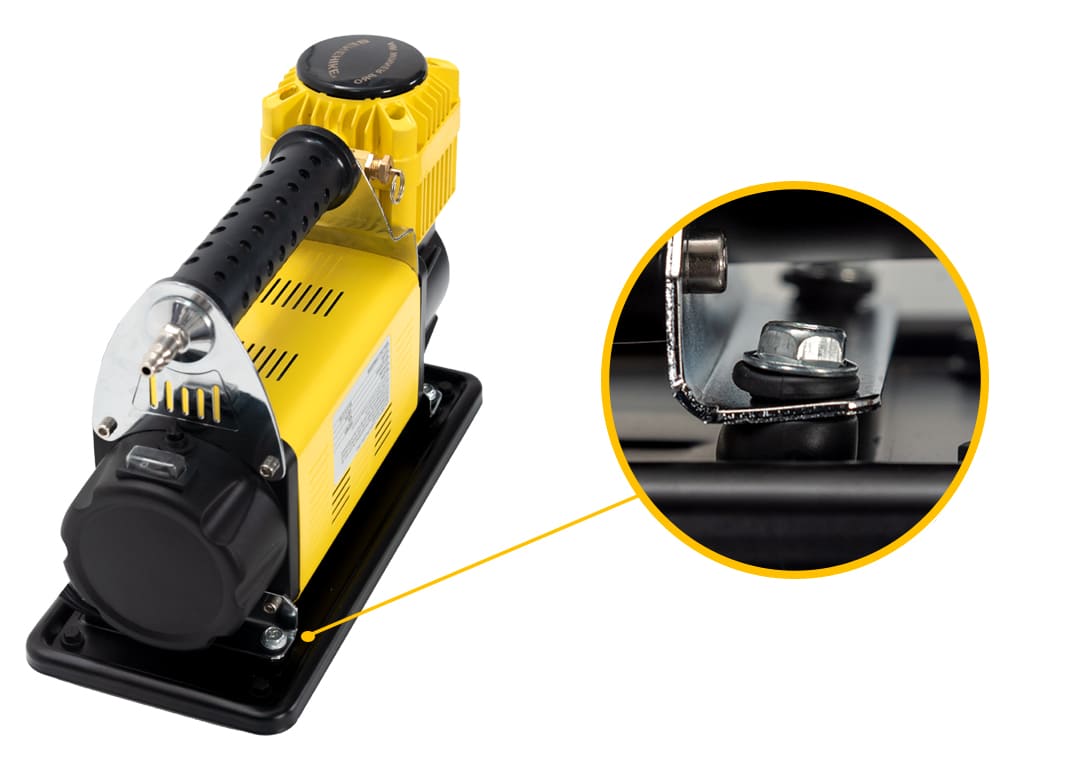 Quality metal hardware and fittings, robust construction, a resilient rubber-mounted base for superior shock absorption, and an alloy body with strategically placed ventilation holes transform this into more than just a swift and portable 12v air compressor. It becomes a reliable and sturdy tool crafted specifically to withstand the challenges of American conditions!