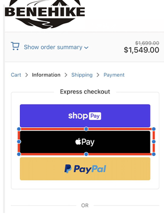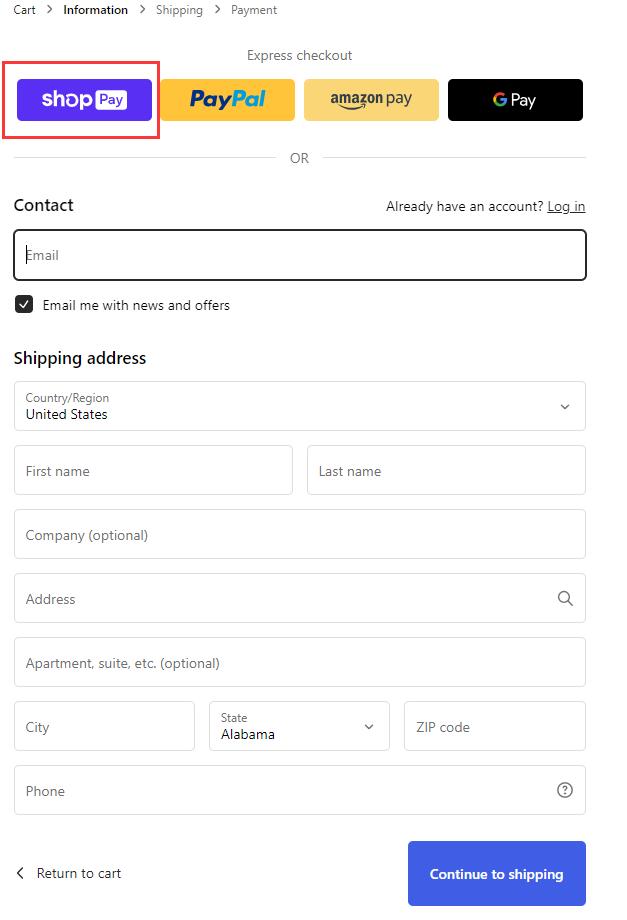 1. After reaching the checkout page, choose your desired method of payment. You can choose the quick checkout method by Paypal, Shop Pay or Apple Pay if you already have an account.If not, please proceed to filling your information on the bottom and click continue to shipping.