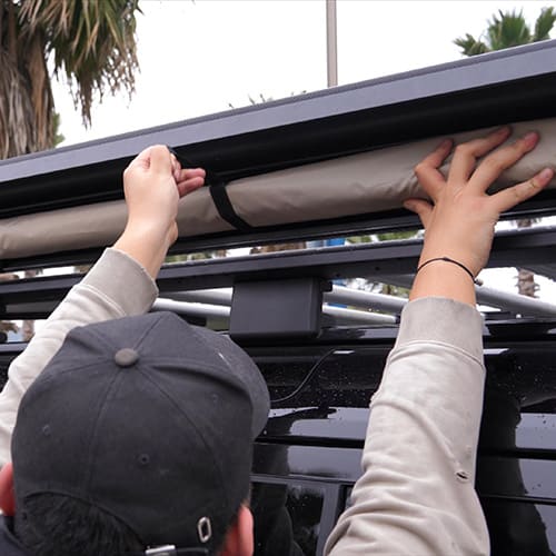 - Extend both supporting poles to the side and affix them to the roof of the awning.