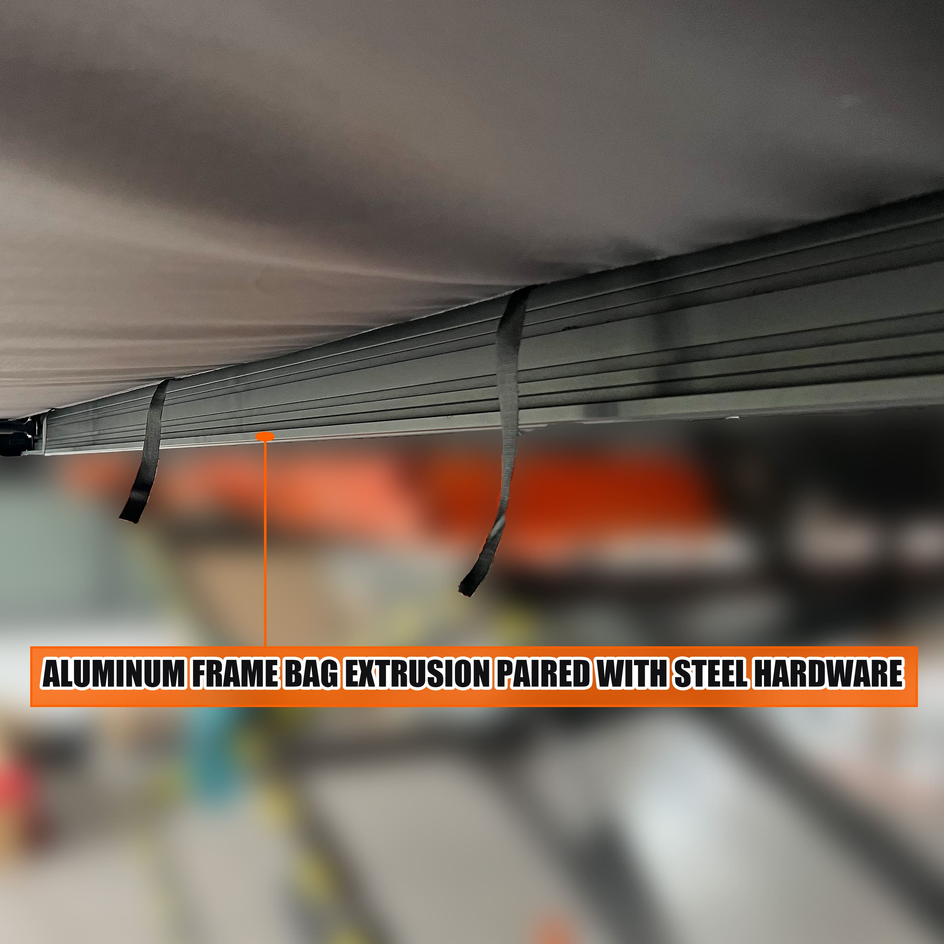 • The canvas is securely fixed to a robust frame through multiple connection points and includes guy ropes to keep it stable in the wind. The lightweight yet sturdy aluminum frame can withstand strong winds and heavy rain.