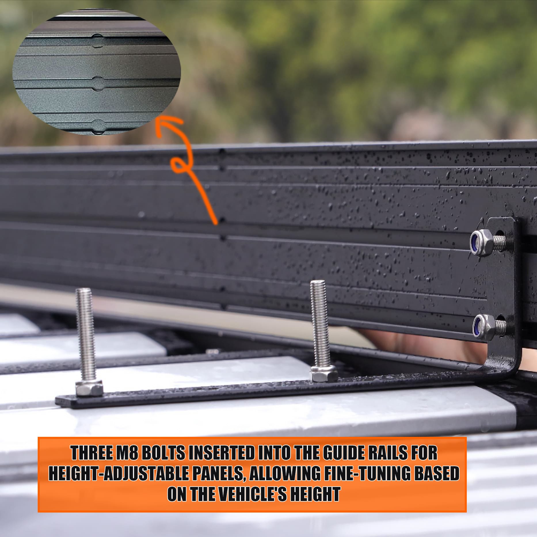 • It can be used in conjunction with rooftop tents, cargo boxes, or our roof racks. The installation rails and accessories are universal, compatible with most roof racks, cars, SUVs, and trucks' sides and rear, requiring just a few seconds to tighten the screws.