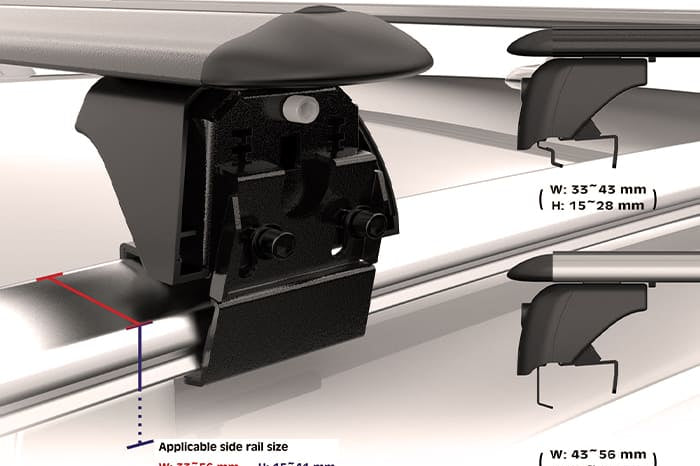 - Silicone cushioning on the connecting clip provides protection for the roof racks.
